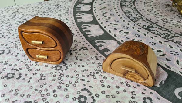 I love the spalted Huon Pine the larger of these bowls were made from. The smaller birdsmouth bowl is made from an old tree branch which I suspect may have been from some kind of fruit tree.